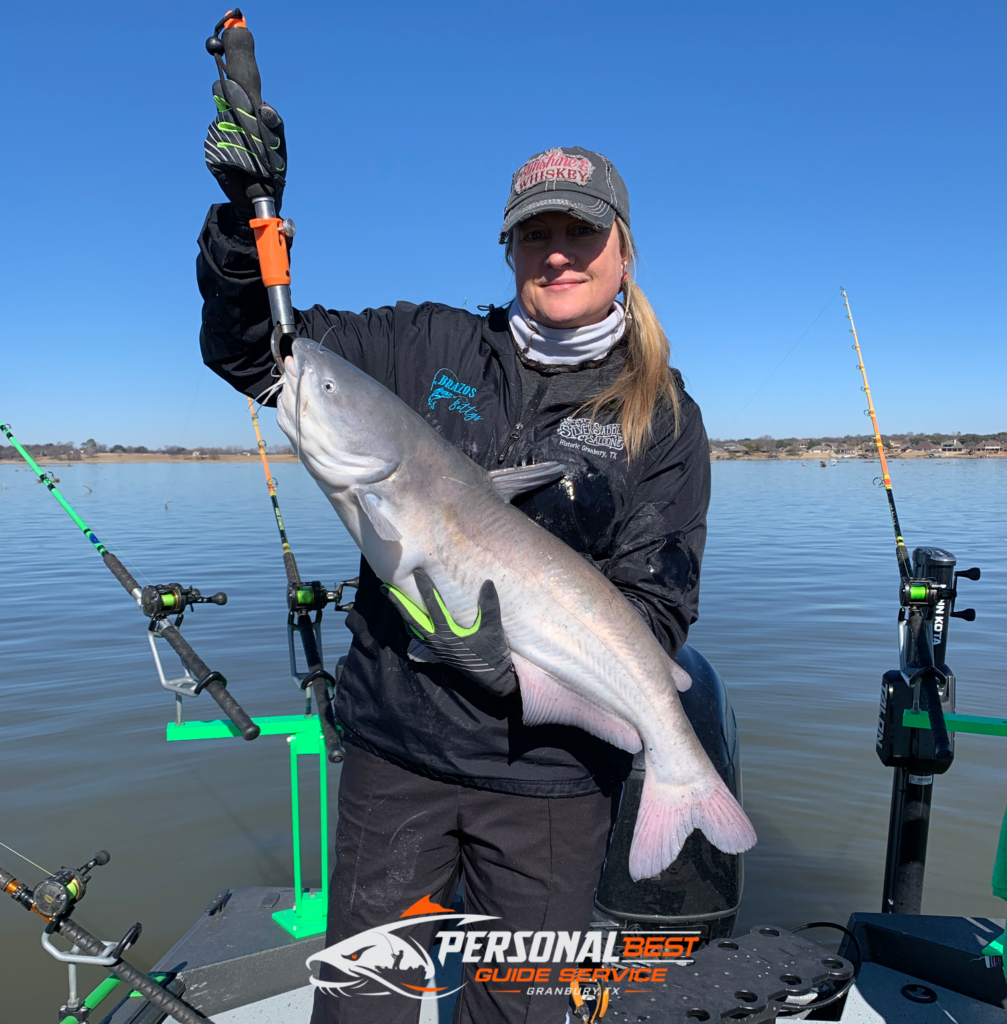 Today I had Rebecca Meadors, owner of Silver Saddle Saloon and David Timm join me for some big cat chasing on Lake Granbury….and she caught a giant!