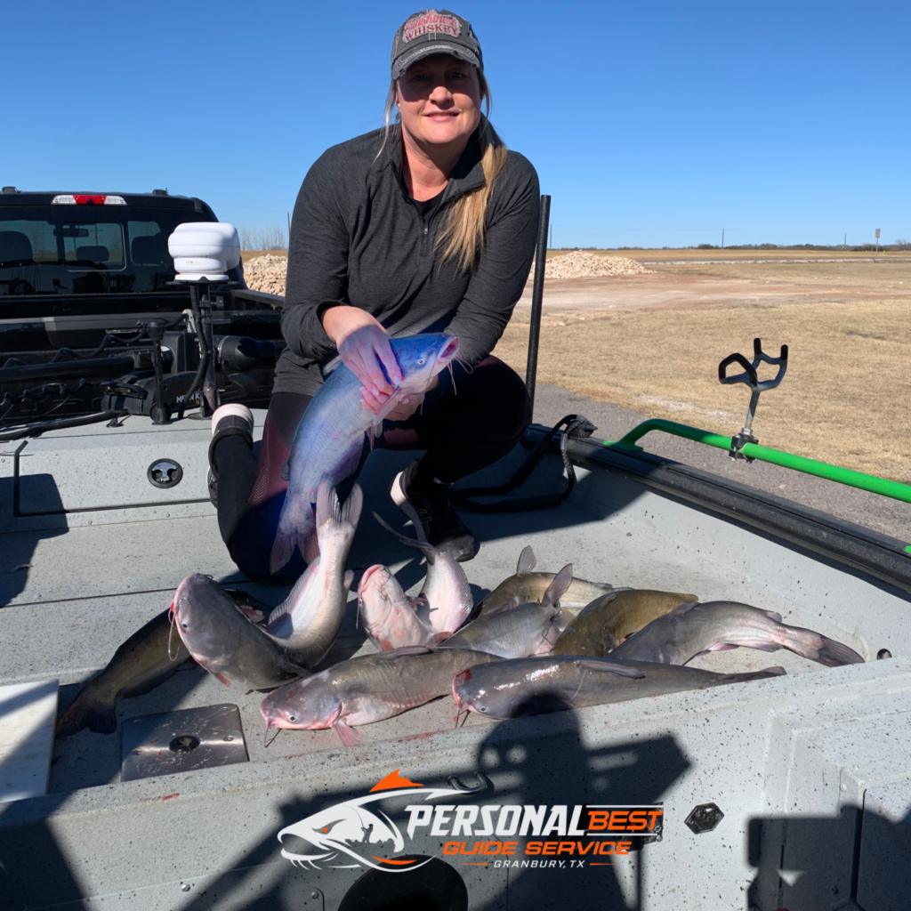 Rebecca isn’t a rookie when it comes to fishing, as she is usually striper fishing with Brazos Bettys fishing team. However, she said it had been a long time since she had been catfishing, and had never caught a big bluecat. Thankfully for her, David had decided to purchase a gift certificate for a guided trip from us!